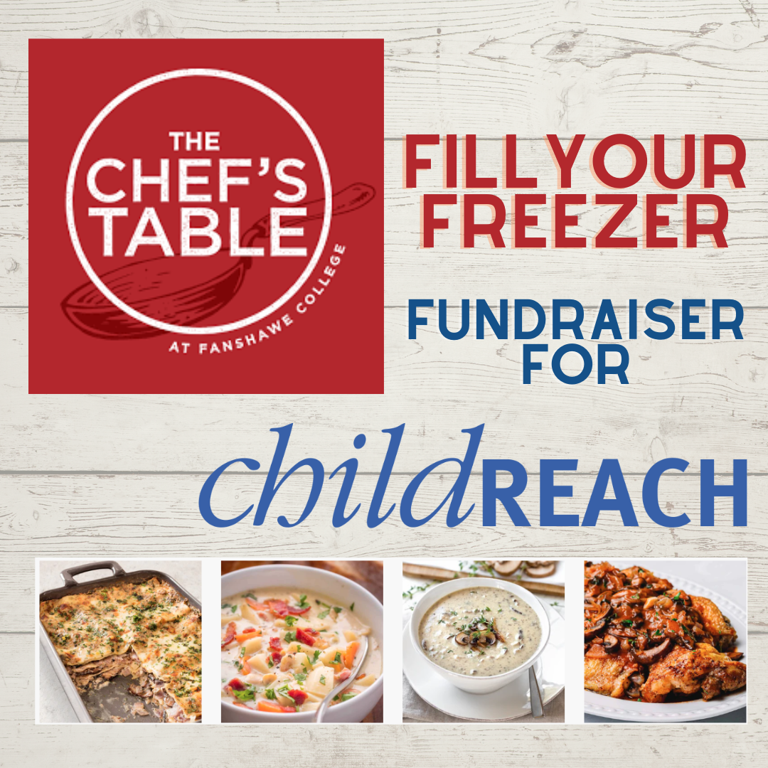 Childreach is partnering with The Chef's Table at Fanshawe College ALL YEAR to offer Chef-prepared family-friendly meals for your freezer. This is a delicious way for you to support Childreach as every order raises funds for our unique programs like Parent Connect and Wild Child Outdoor Playgroup ! Visit the Childreach Partnership Menu in the Chef’s Table online store at https://thechefstablefanshawe.ca/collections/childreach to place your order today!