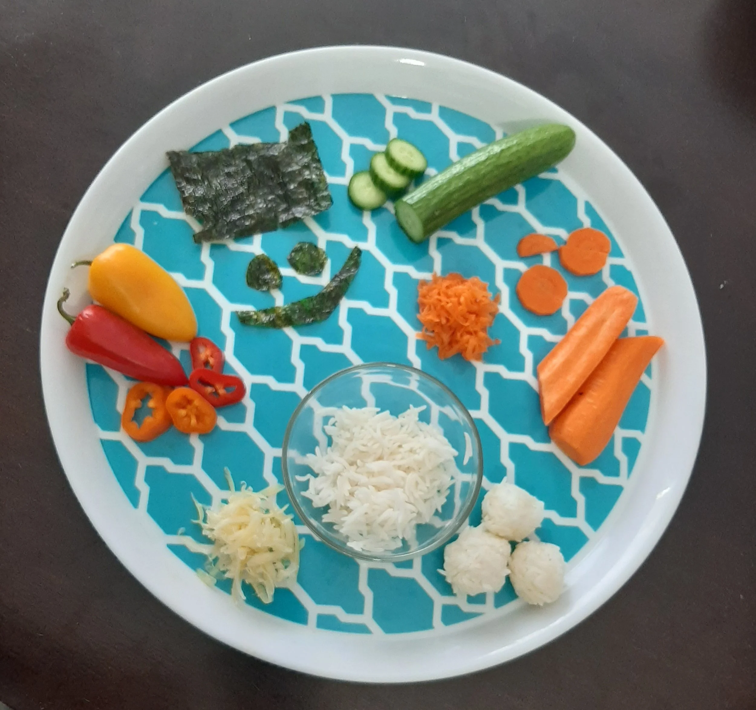 Make the mouth and the iris of the eyes with seaweed (you can it into funny shapes with kitchen scissors.) You can also use a few drops of ketchup.