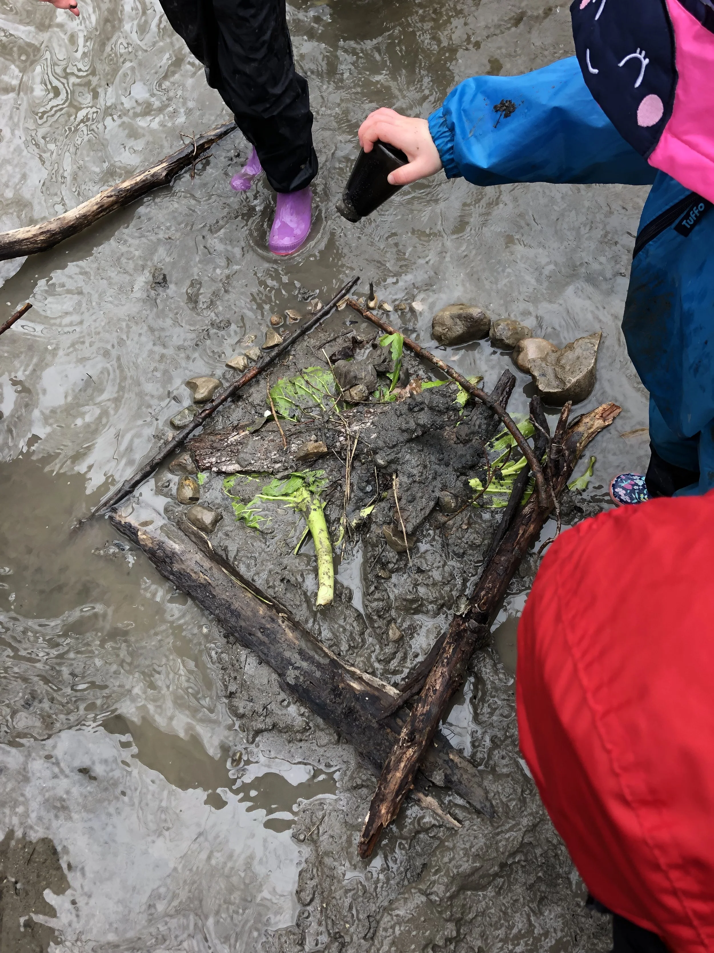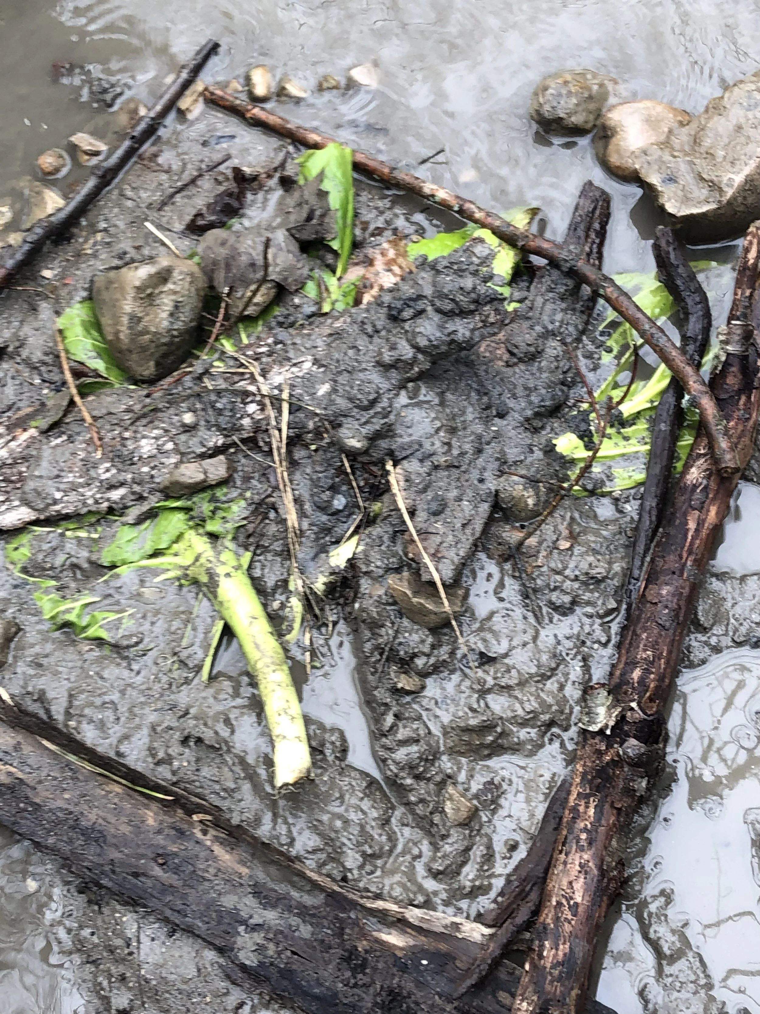 A square made out of sticks with a mixture of mud, rocks, and leaves in the middle.