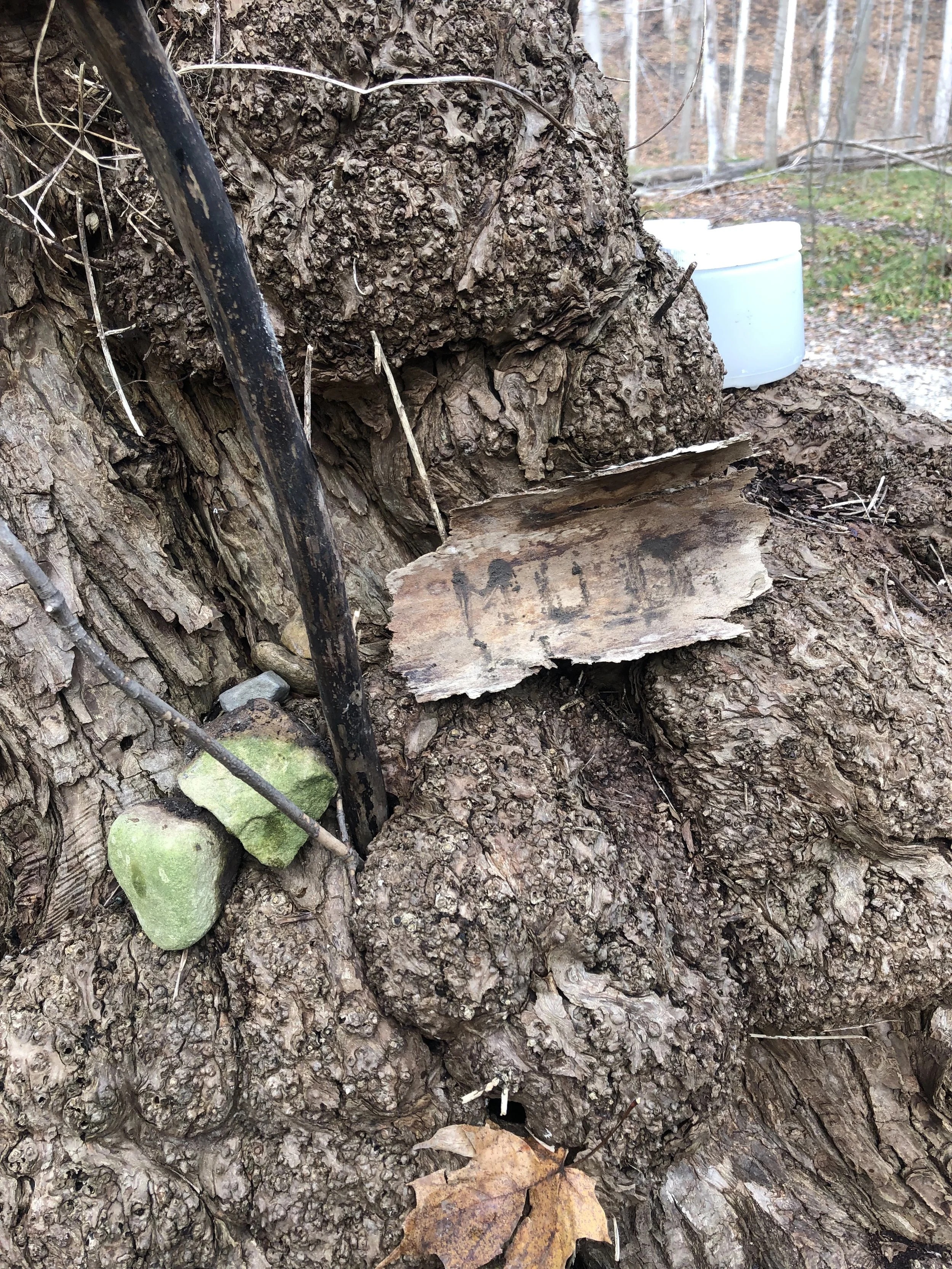 Mud Kitchen: A piece of bark leaning on a tree with the word “mud!” written on it.