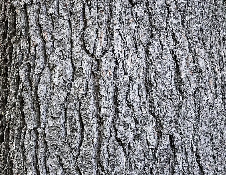 The bark of the Eastern White Pine is smooth and gray when the tree is young but becomes deeply ridged and furrowed, resembling a jigsaw puzzle, as it ages. This tree is an excellent example of how bark can provide protection and insulation.