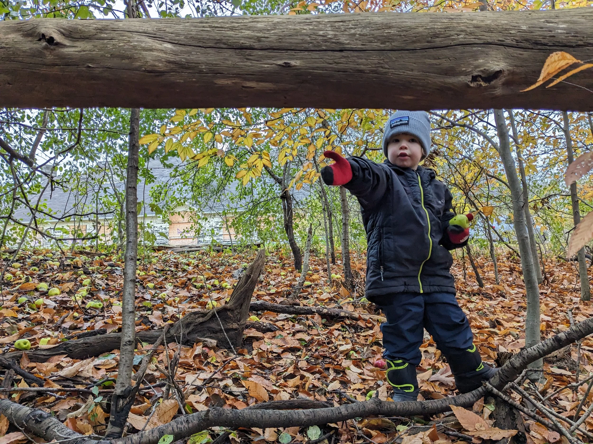 A toddler points to a hollow in the fallen log where he has hidden several fallen apples that he collected.