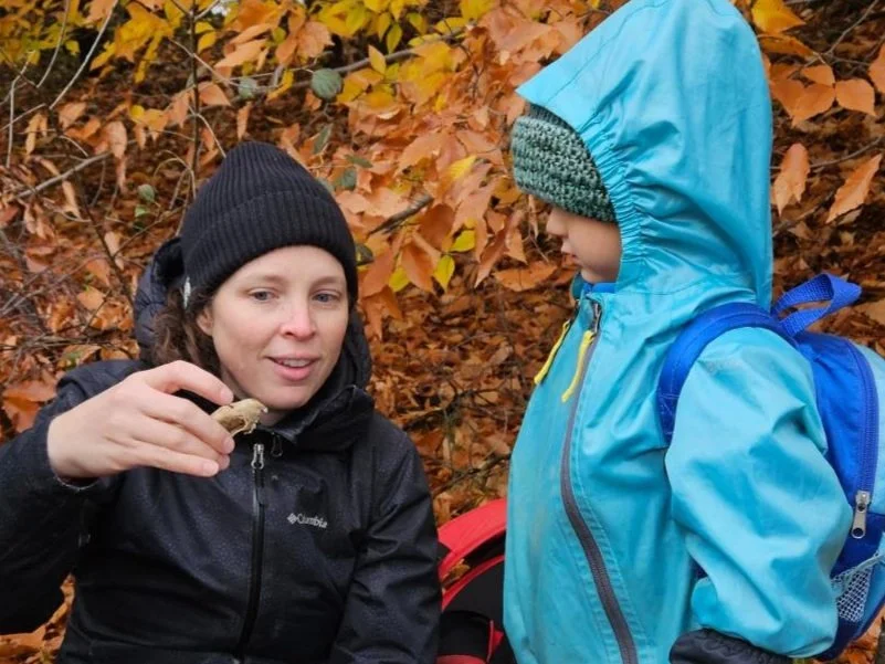 A Wild Child program facilitator examines a scull found by the children with a preschooler.