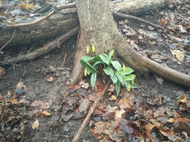 Trout Lillies don’t flower for the first 5-7 years of life and only produce a single leaf during those years. See if you can spot young and mature plants on your walks.