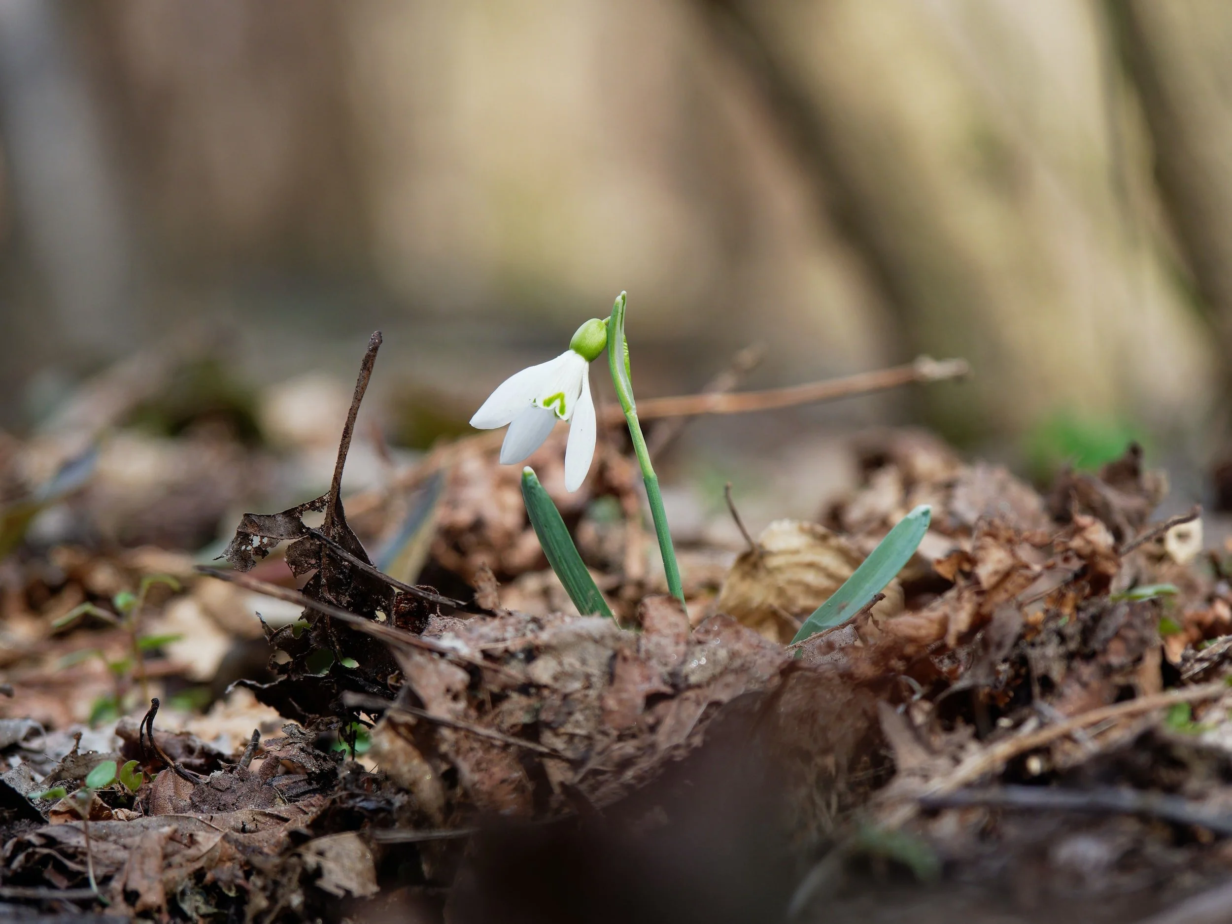 A snowdrop flower starting to bloom in the leaf litter